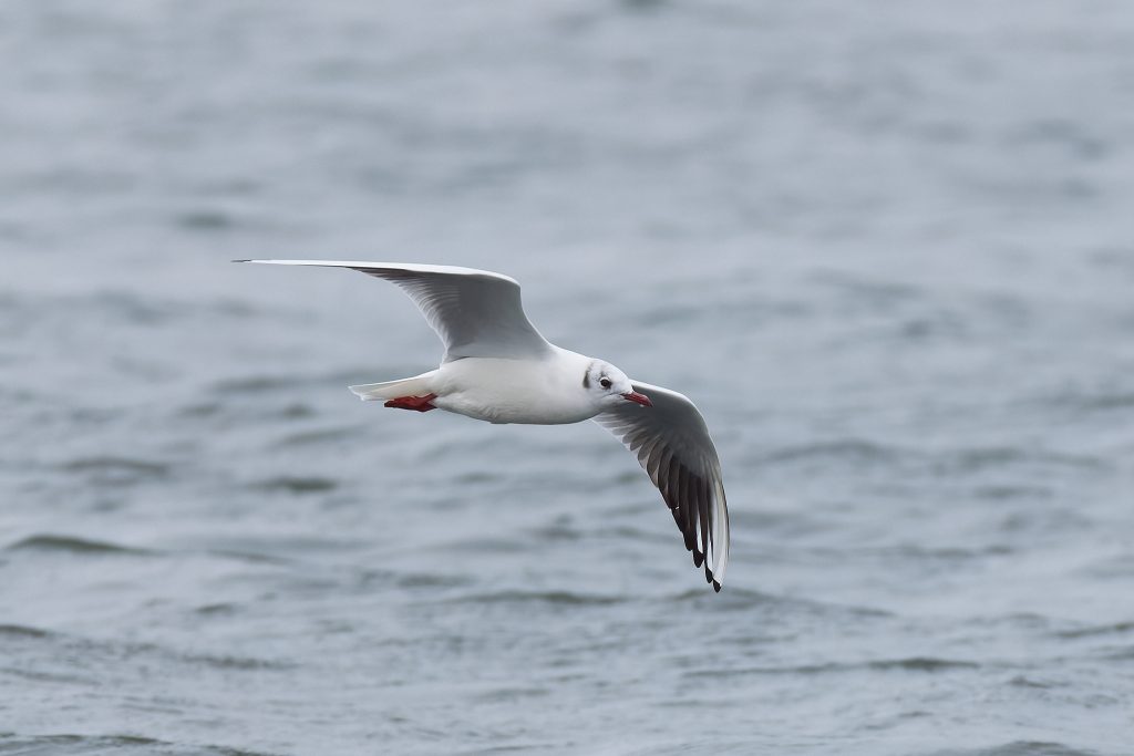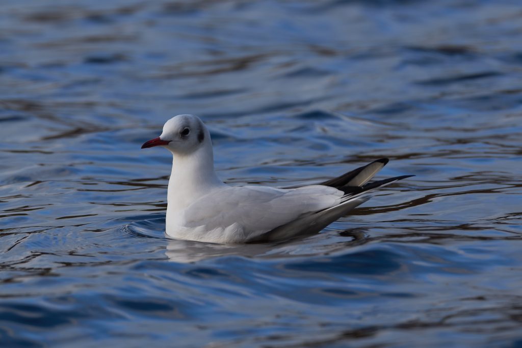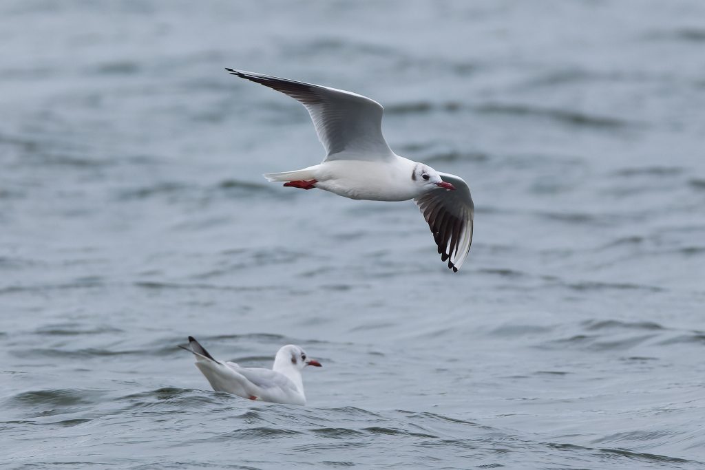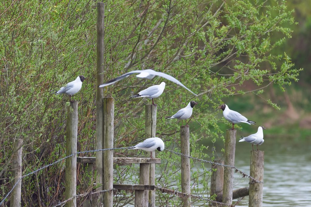 Black Headed Gulls. The head turns black in a breeding season and you can see that on some.