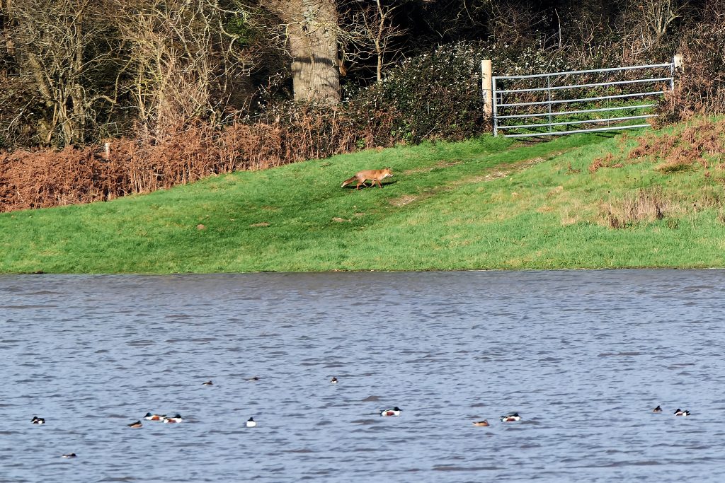 Some deer were seen crossing the water at the far side. Someone owns a nice house on the shoreline, and a fox on patrol.
