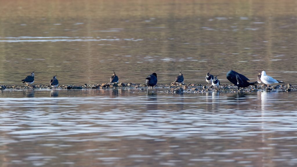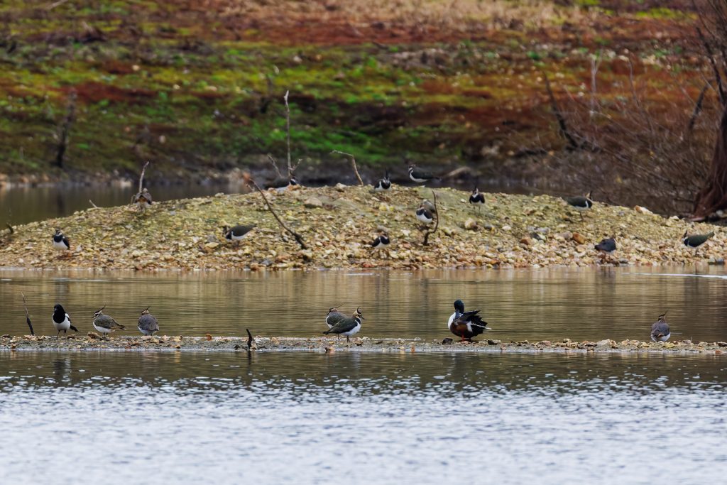 A Starling, Swan, Perrigin sat alone in the distance, a pair of Shoveler, Black Headed Gull staring down two Lapwing, Tufted Duck, Teal, Coot and a Herring Gull.