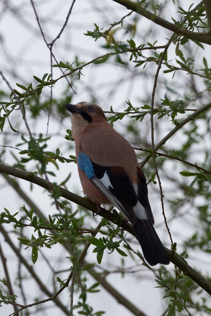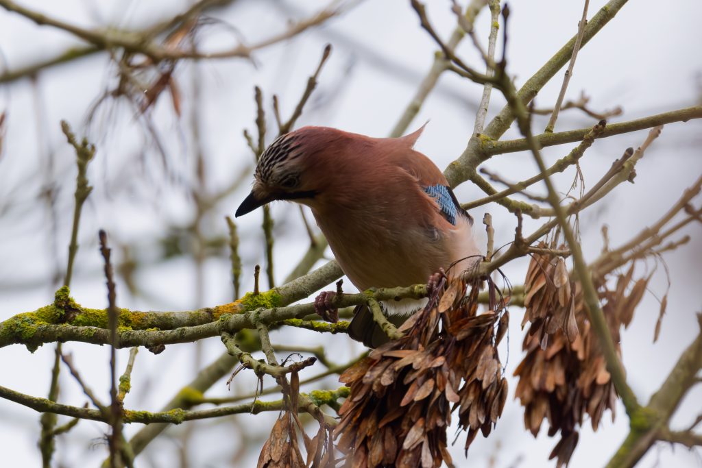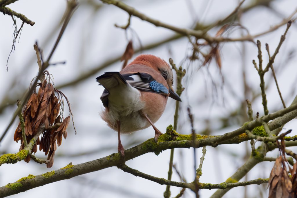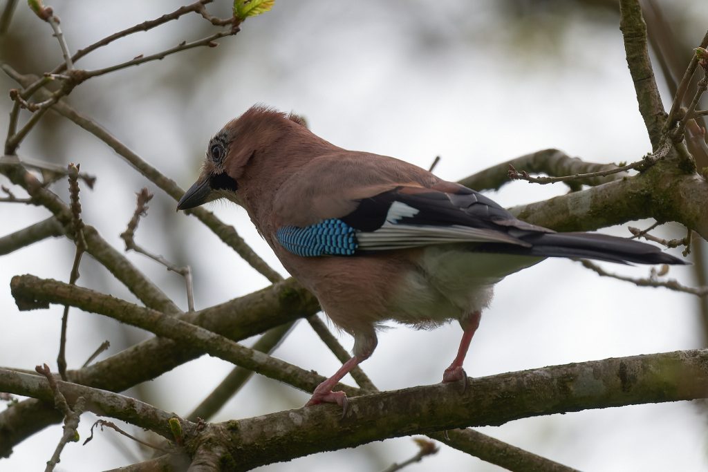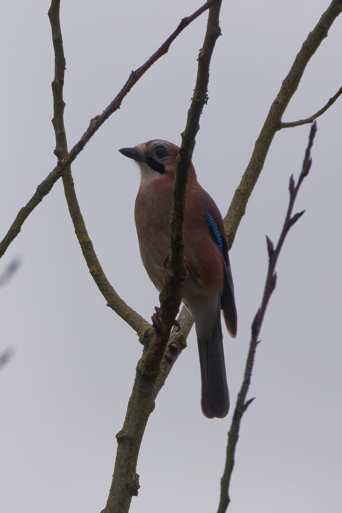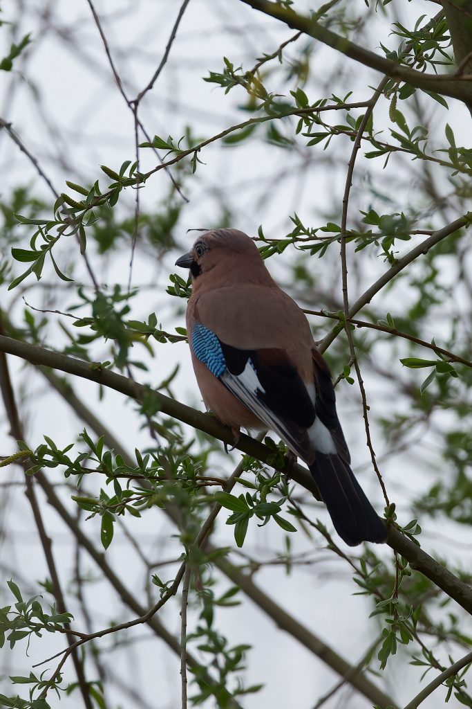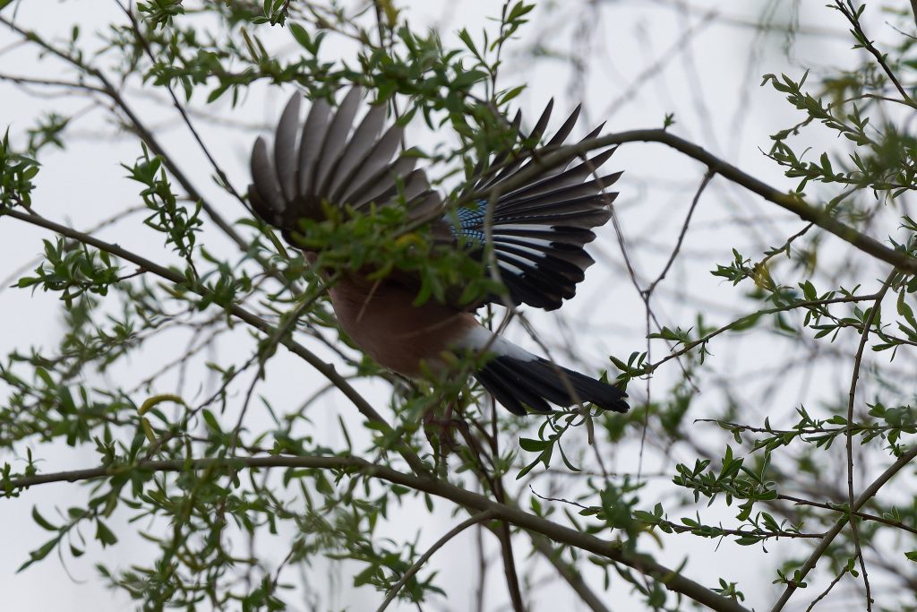 I stalked a great spotted woodpecker for a couple of minutes until it flew off. This was the clearest image I managed to get. Same story for this jay.