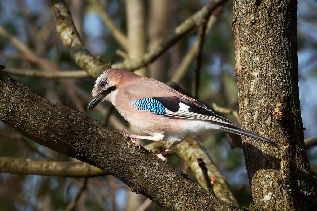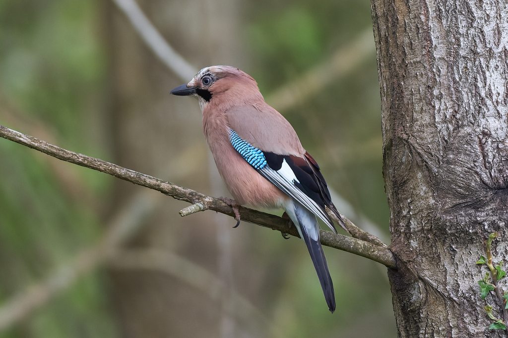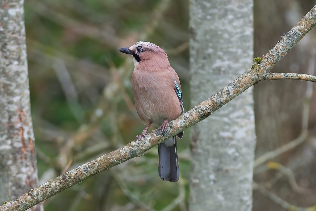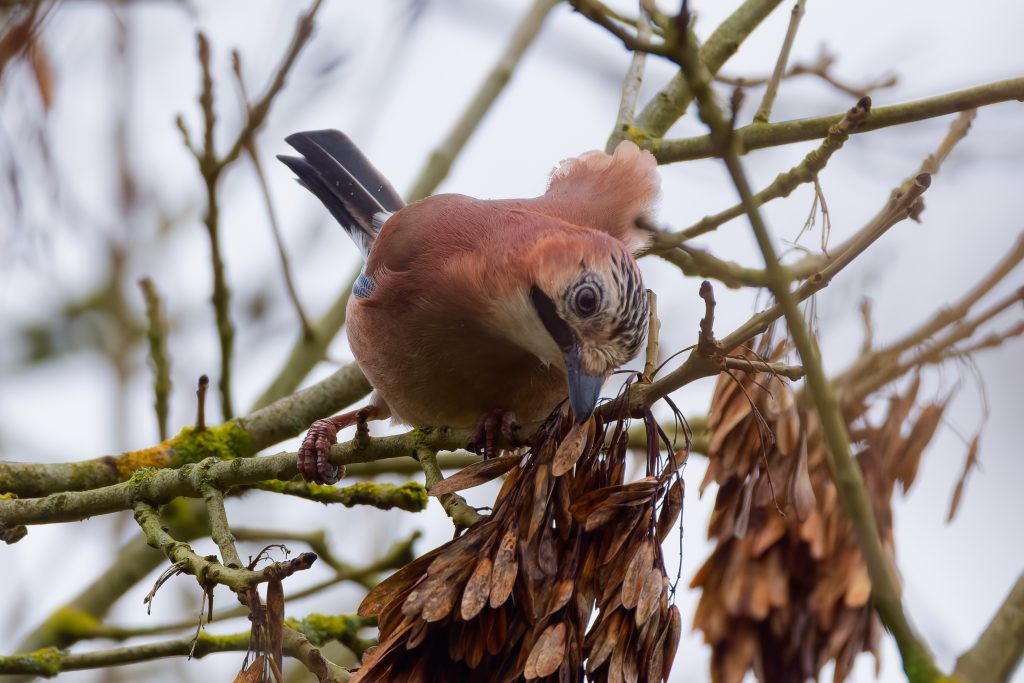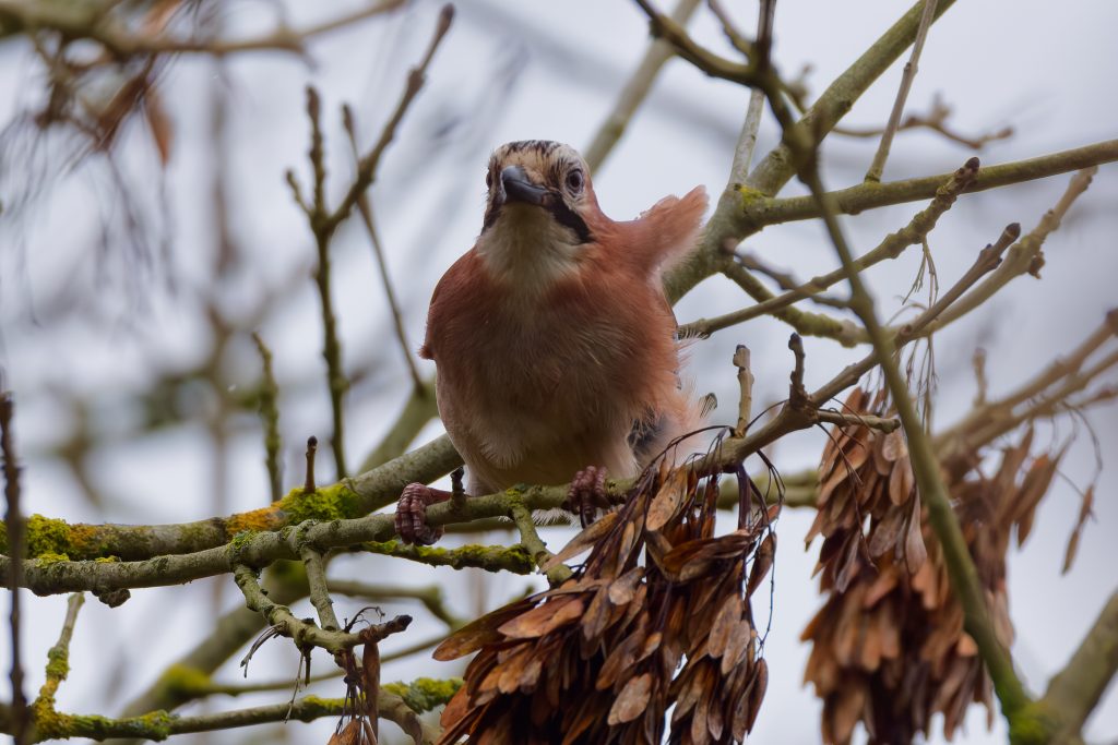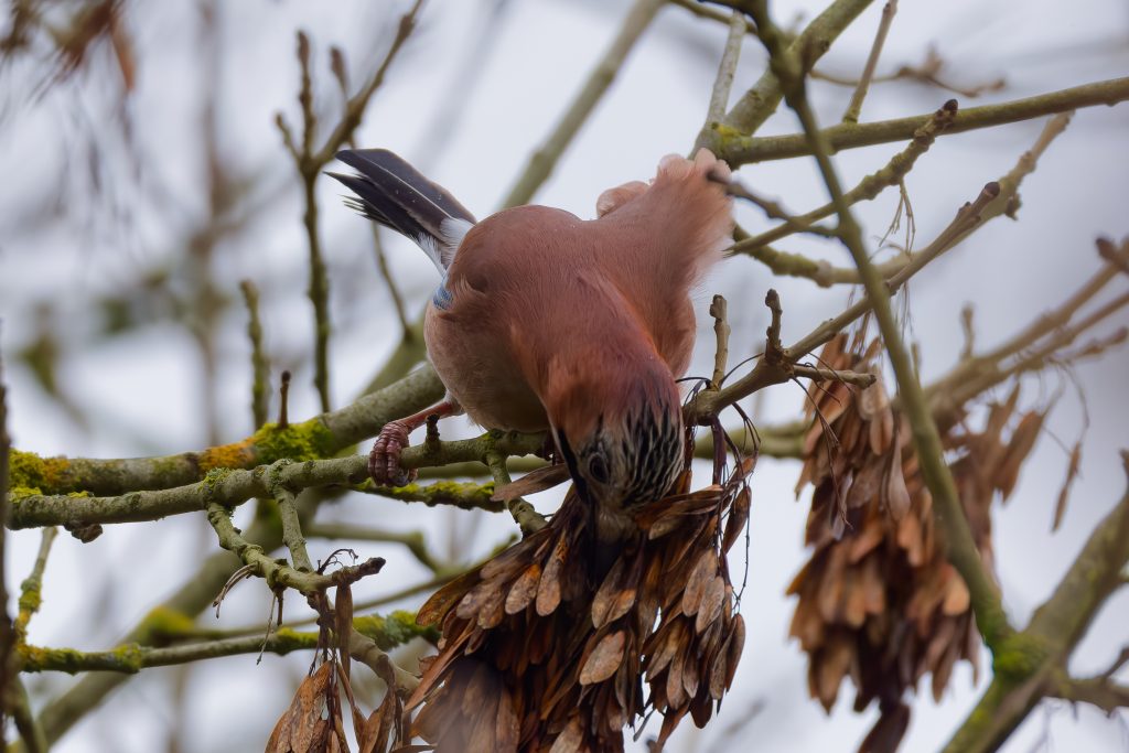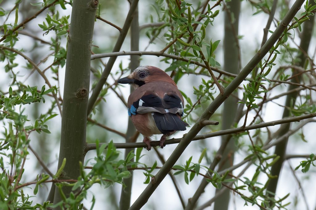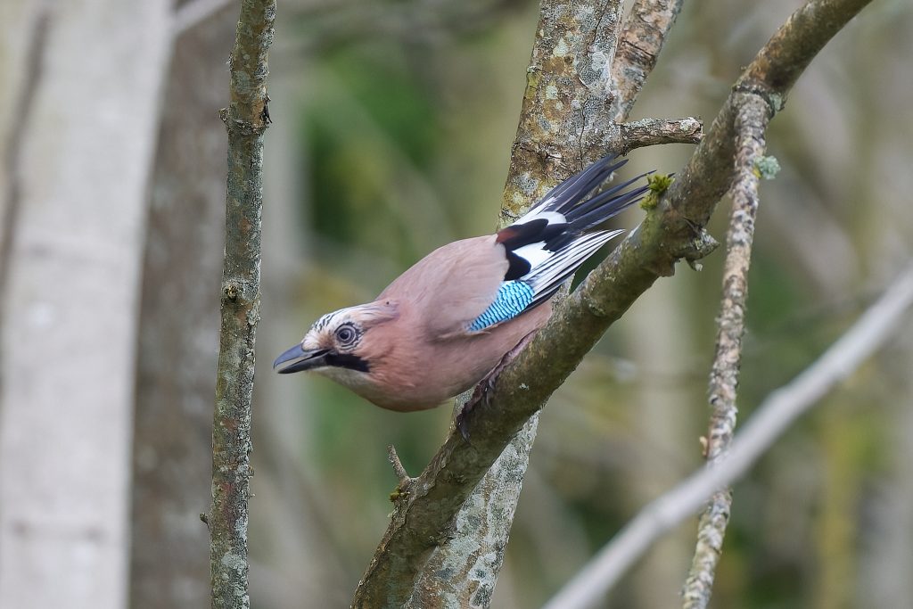 I stalked a great spotted woodpecker for a couple of minutes until it flew off. This was the clearest image I managed to get. Same story for this jay.