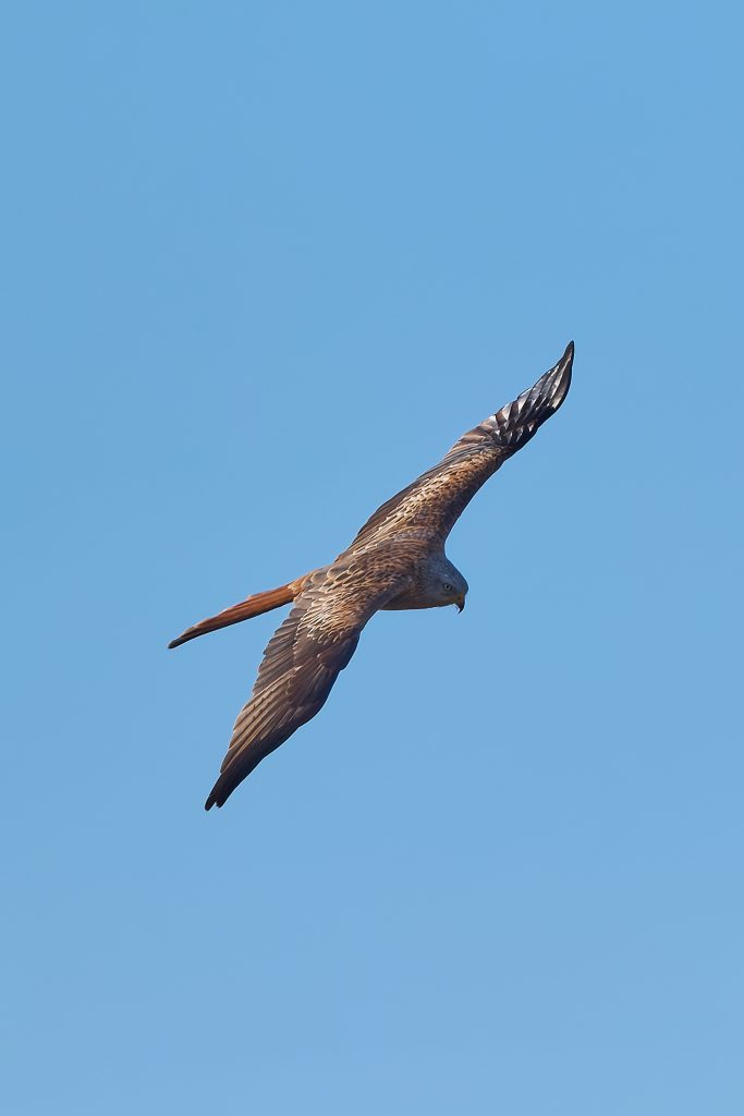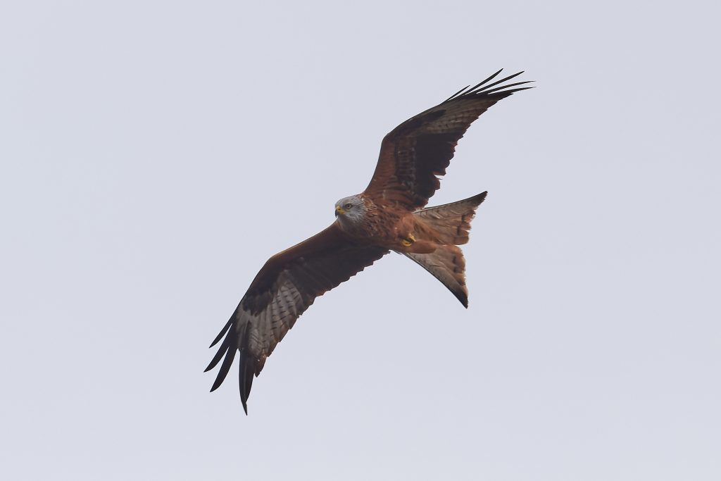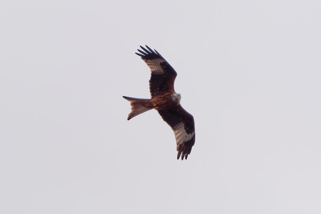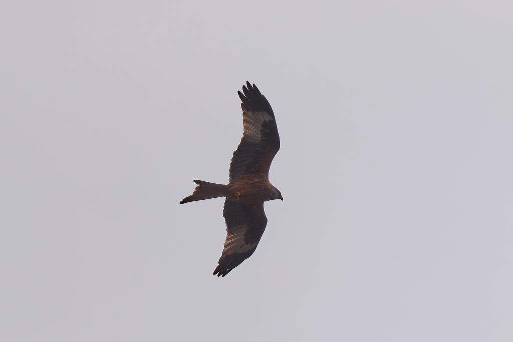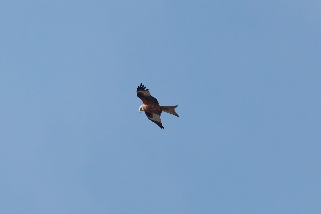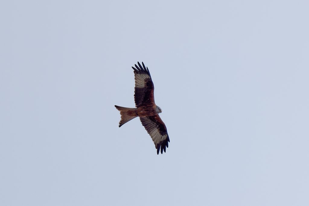 My previous Red Kite images were all taken when the bird was very high and the images had to be cropped heavily. Today, it was very high too, soaring on the wind looking for prey to eat. But after a while it appeared behind my much lower in the sky over trees. So, these retained some image quality by not having to cropped so heavily, but suffer from the sky being so dark. One day, I’ll be in the right place at the right time and catch a Red Kite that is not too high, not too far away and in good light.