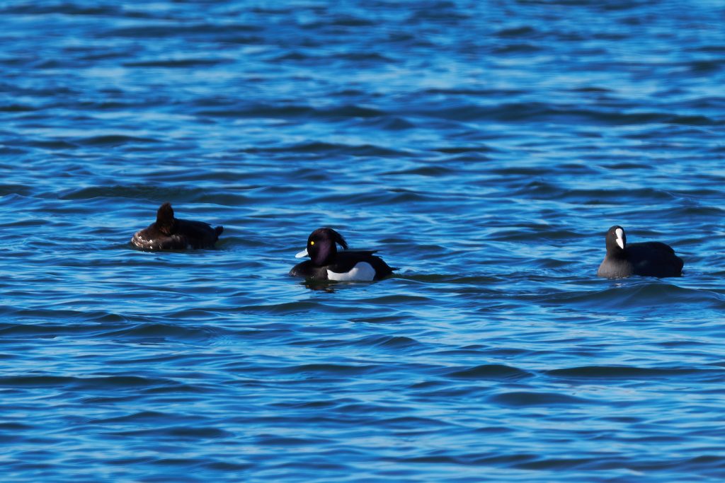 A distant Red Kite and Tufted Ducks.