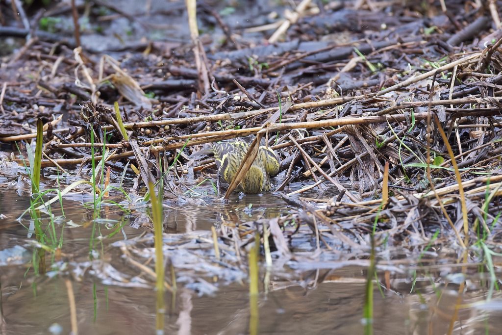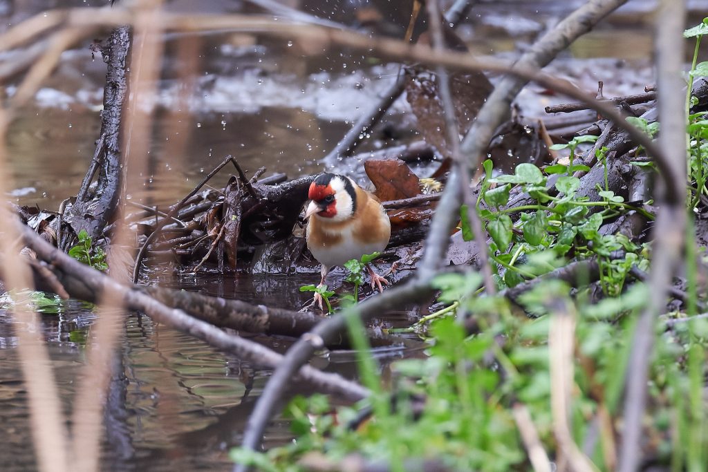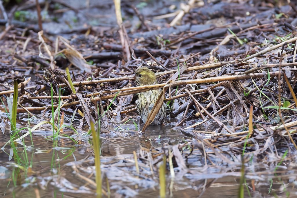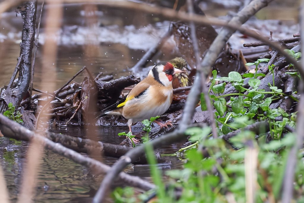 In the stream/river that runs though the meadow, there was a lot of woody material that looked like it might cause a blockage. I noticed some movement and it turns out to be a Siskin having a bath, and a Goldfinch taking a drink.