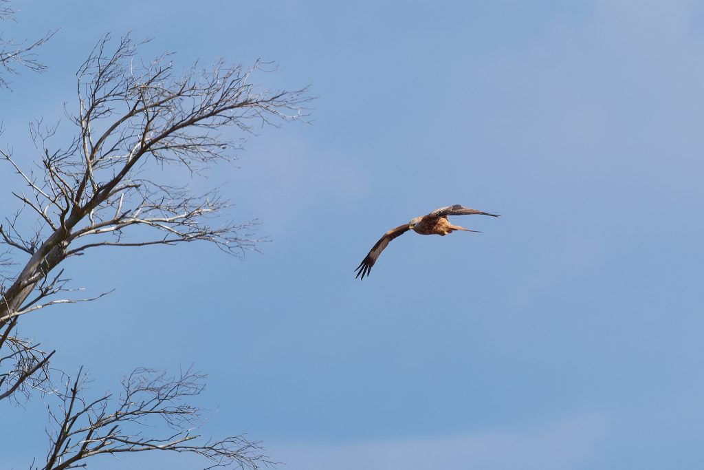 Another walk around the meadow today. Very quiet in the bird sense. Many birds on the water seem to have flown away when it froze over last week. Could not spot much in the forested areas either. However, I did spot a Red Kite soaring overhead.