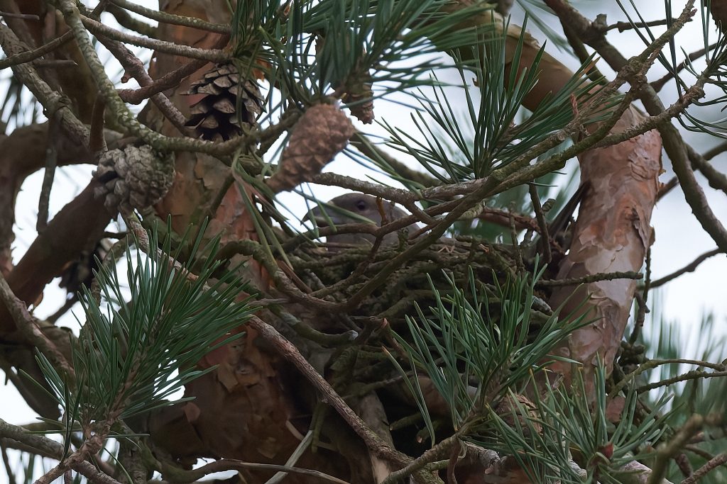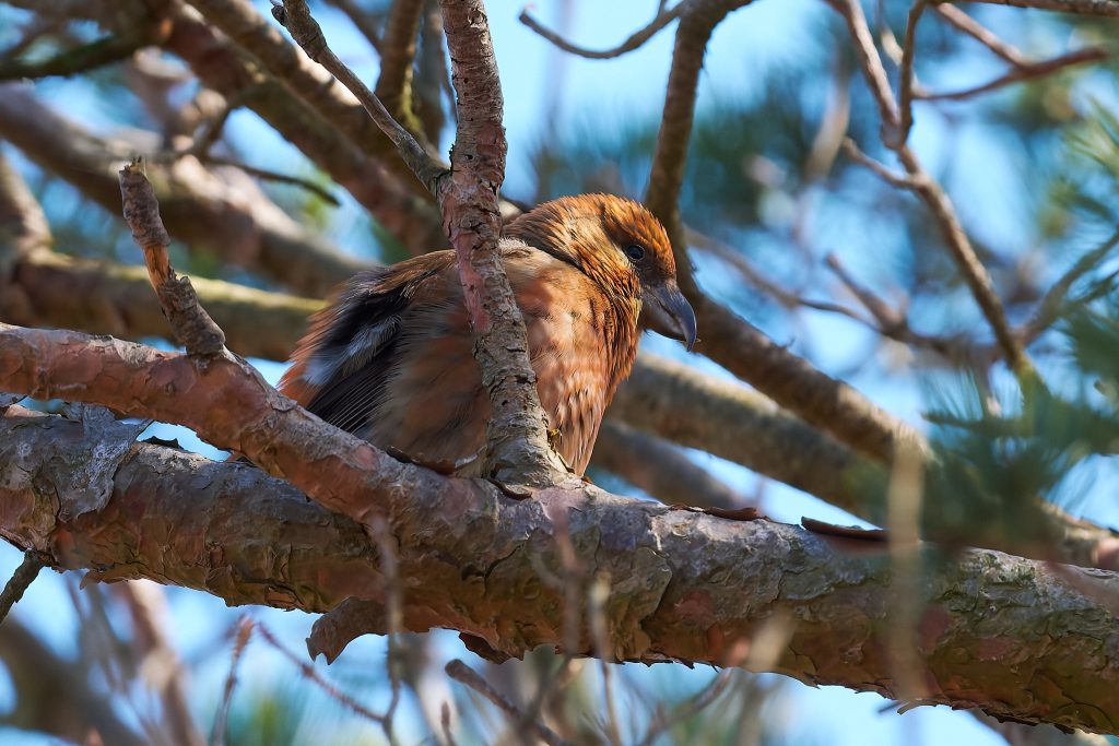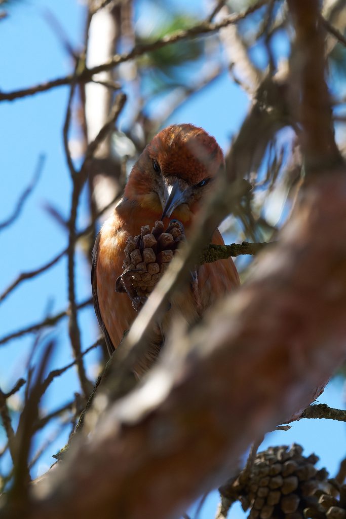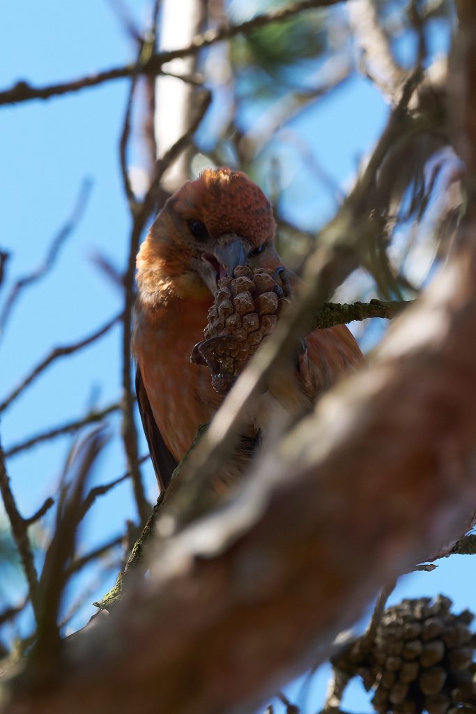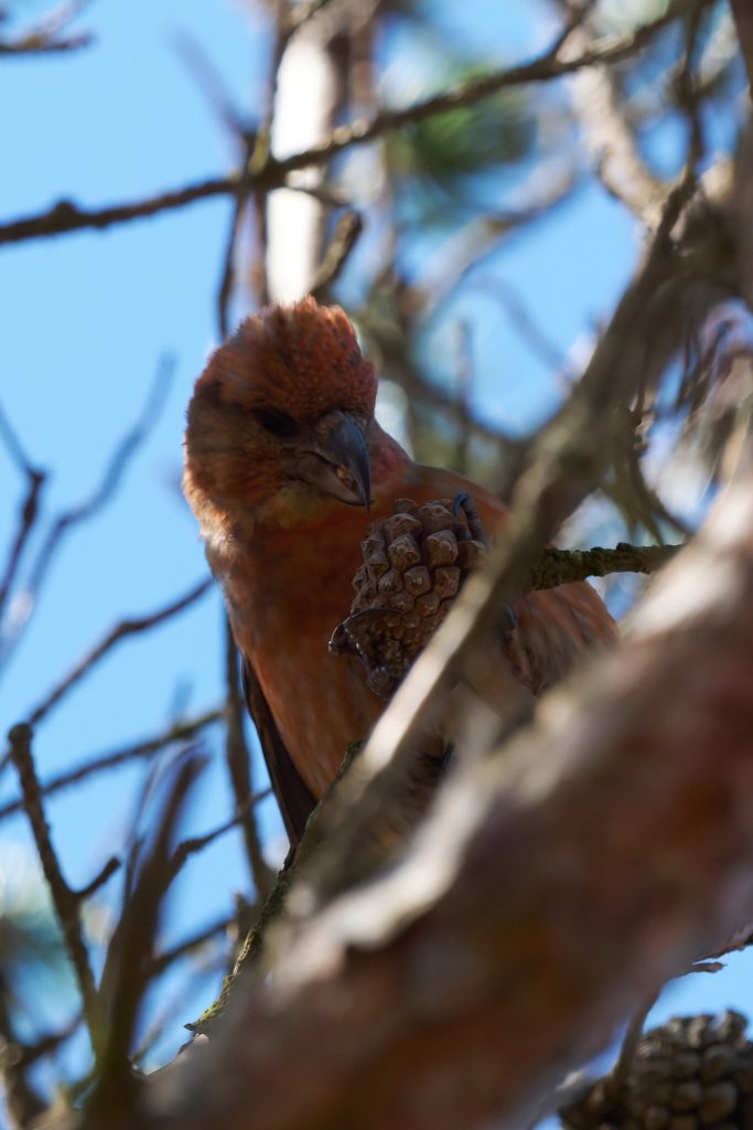 I heard a bird in a tree on the boardwalk and it took a minute to two find it, but it was a male Crossbill! I didn’t take long for others to stop and see what I was paying so much attention too and before long at least a dozen birders and photographers we standing around this tree. They eat the fur cones, and if they are nesting take it back to the female who is sat on the egg. The Crossbill nest I photographed a week or 2 ago has completely disappeared. Not sign of it at all. Hopefully Malcolm wasn’t right when he said someone might try to steal the eggs if its location became too widely known but it seems odd that the nest has gone. It was unfortunately within 8 feet of the footpath so anything is possible.