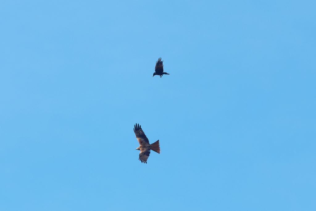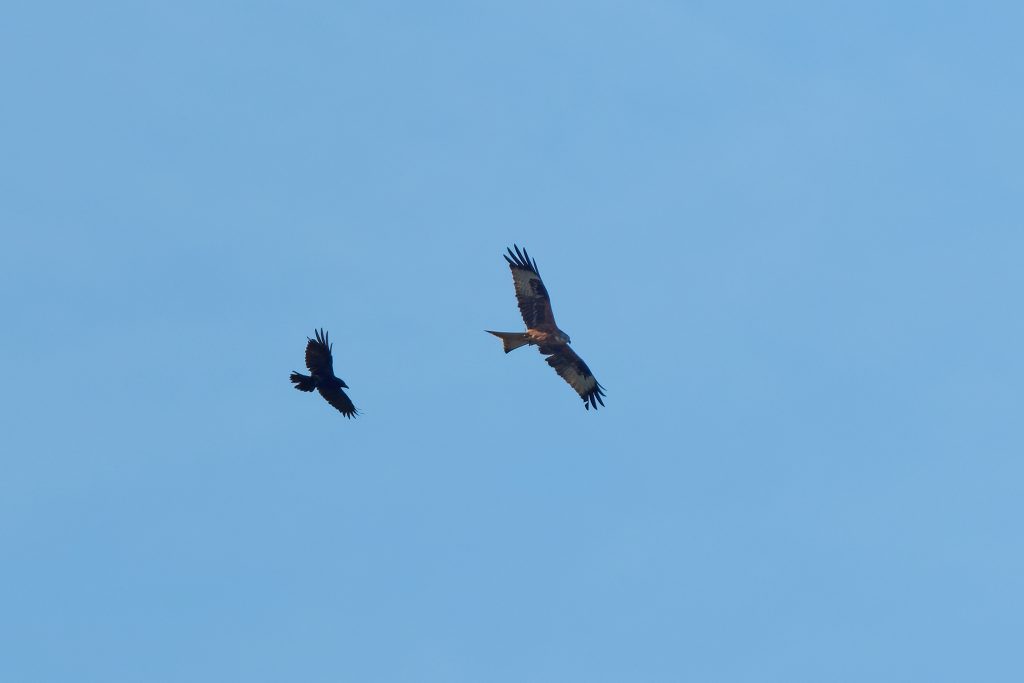This Red Kite was being harassed by a crow for quite some time. I suspect the crow is being territorial. After soaring for a while, it dived down to the ground and was quickly surrounded by crows. I suspect it caught lunch in the process. The images of it on the ground were very distant.