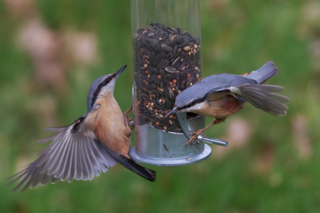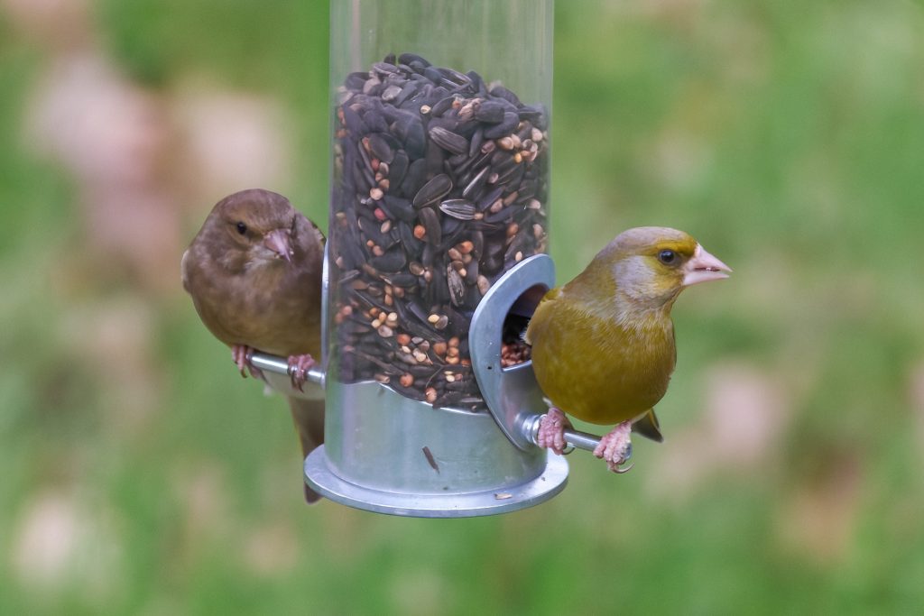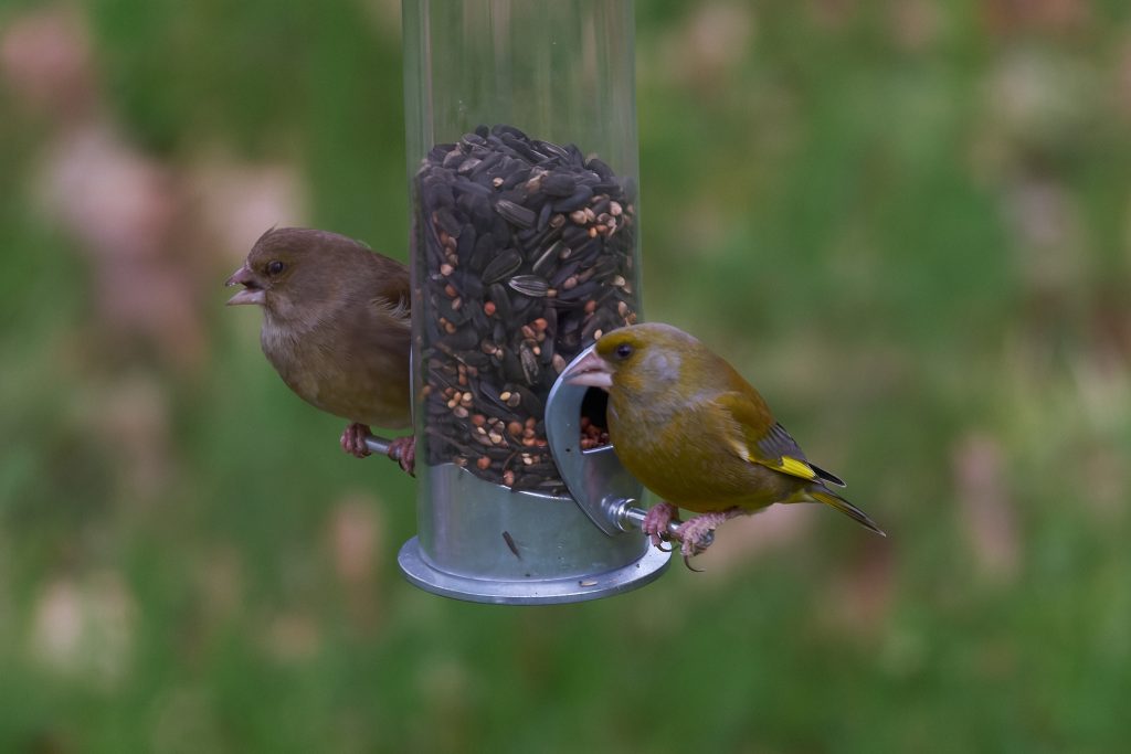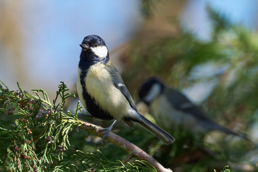 A pair of Great Tit. Possibly juvenile because their colours are quite muted.